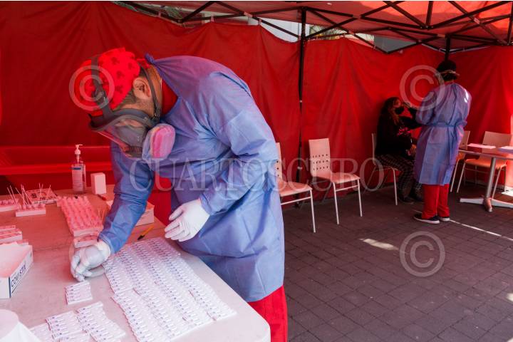Un médico coloca la muestra de mucosa en una prueba covid-19 en el kiosco de la plaza Forum Buenavista, a su espalda una médico explica el procedimiento a una joven.