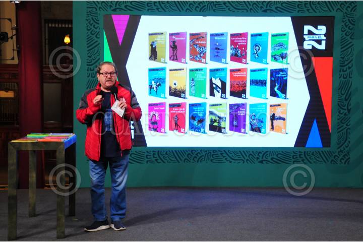 Paco Ignacio Taibo II, director del Fondo de Cultura Económica, presenta la edición 21 para el 21, una serie de libros que se reeditaron para las celebraciones de la Independencia de México.