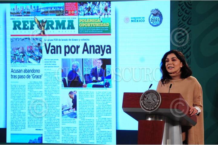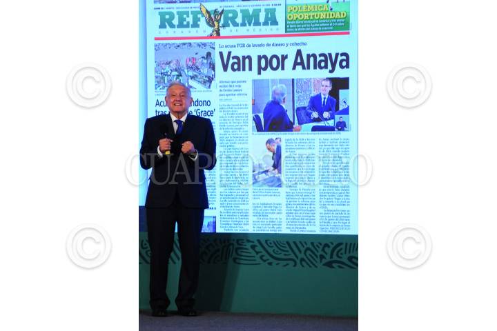 Andrés Manuel López Obrador, presidente de México, responde preguntas de los reporteros durante la conferencia mañanera mientras señala la portada del periódico Reforma.