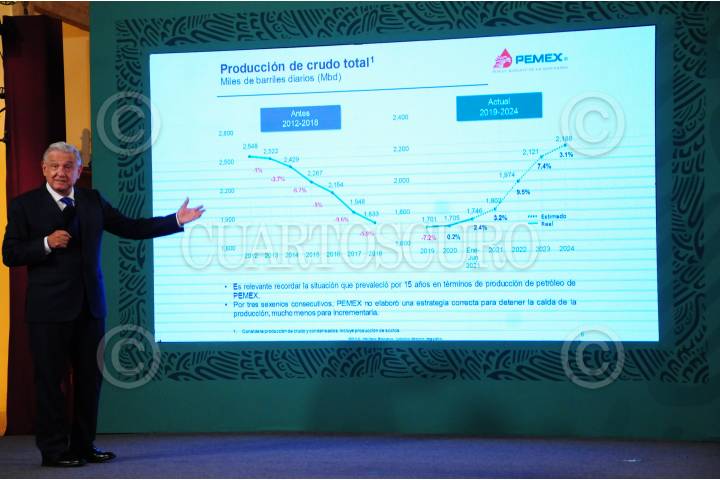 Andrés Manuel López Obrador, presidente de México, muestra el crecimiento de producción de crudo durante su gobierno.