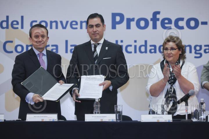 MÉXICO, D.F., 13MARZO2012.-Mikel Arriola, presidente de la Comisión Federal para la Protección de Riesgos Sanitarios (COFEPRIS), Bernardo Altamirano, titular de la Procuraduria Federal del Consumidor (PROFECO), y Margarit aLuna Ballina, especialista en publicidad y medios de comunicación, durante la firma de convenio con la COFEPRIS para combatir la publicidad engañosa. FOTO: JUAN PABLO ZAMORA /CUARTOSCURO.COM