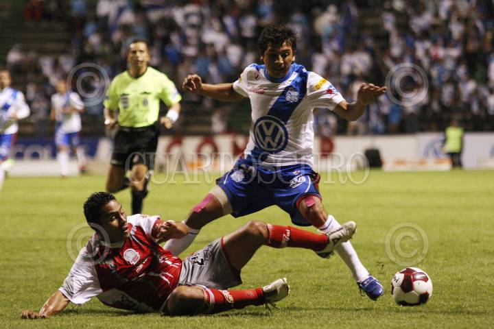 PUEBLA, PUEBLA, 07AGOSTO2012.- Ismael Íñiguez del Puebla, logra mantener el balón durante una barrida durante el partido de la tercera jornada de la Copa MX disputado en el estadio Cuahutémoc en el que los camoteros se adelantan 2-0 en el marcador. FOTO: HILDA RÍOS /CUARTOSCURO.COM