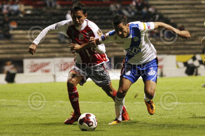 PUEBLA, PUEBLA, 07AGOSTO2012.- Isaac Romo del Puebla disputa el balón ante su contrincante de Lobos de la BUAP durante el partido de la tercera jornada de la Copa MX disputado en el estadio Cuahutémoc en el que los camoteros se adelantan 2-0 en el marcador. FOTO: HILDA RÍOS /CUARTOSCURO.COM
