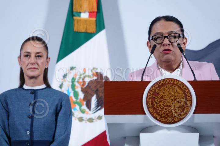 CIUDAD DE MÉXICO, 25MARZO2025.- Claudia Sheinbau, presidenta de México, y Rosa Icela Rodríguez, secretaria de Gobernación, durante la conferencia “Mañanera del Pueblo” en la que se presentó en informe semanales materia de seguridad. FOTO: GALO CAÑAS/CUARTOSCURO.COM