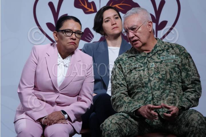 CIUDAD DE MÉXICO, 25MARZO2025.- Rosa Icela Rodríguez, secretaria de Gobernación, y Ricardo Trevilla Trejo, secretario de la Defensa Nacional, durante la conferencia “Mañanera del Pueblo” en la que se presentó en informe semanales materia de seguridad. FOTO: GALO CAÑAS/CUARTOSCURO.COM