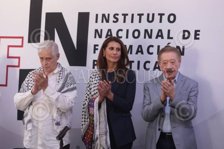 CIUDAD DE MÉXICO, 15MAYO2025. Rafael Barajas, Excelentísima embajadora de Palestina Nadya Rasheed y Héctor Díaz-Polanco durante la jornada de solidaridad con el pueblo de Palestina y conmemoración de los 77 Años de la Nakba, en el Instituto Nacional de Formación Política. FOTO: EDGAR NEGRETE LIRA/CUARTOSCURO.COM