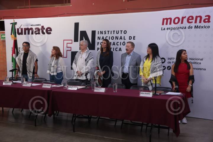 CIUDAD DE MÉXICO, 15MAYO2025. Dip. Manuel Vázquez Arellano, Dip. Magdalena Rosales, Dip. Gabriela Jiménez, Rafael Barajas, Excelentísima embajadora de Palestina Nadya Rasheed, Héctor Díaz-Polanco y Alina Duarte durante la jornada de solidaridad con el pueblo de Palestina y conmemoración de los 77 Años de la Nakba, en el Instituto Nacional de Formación Política. FOTO: EDGAR NEGRETE LIRA/CUARTOSCURO.COM