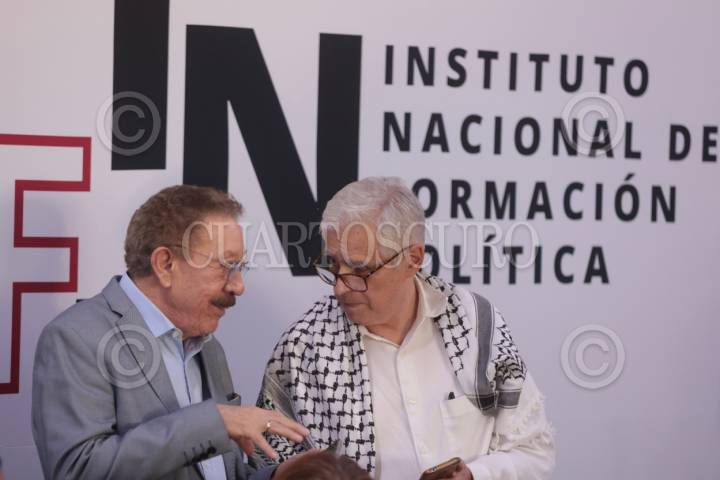 CIUDAD DE MÉXICO, 15MAYO2025. Héctor Díaz-Polanco presidente de Morena en la Ciudad de México y Rafael Barajas “El Fisgón” director del INFP durante la jornada de solidaridad con el pueblo de Palestina y conmemoración de los 77 Años de la Nakba, en el Instituto Nacional de Formación Política. FOTO: EDGAR NEGRETE LIRA/CUARTOSCURO.COM