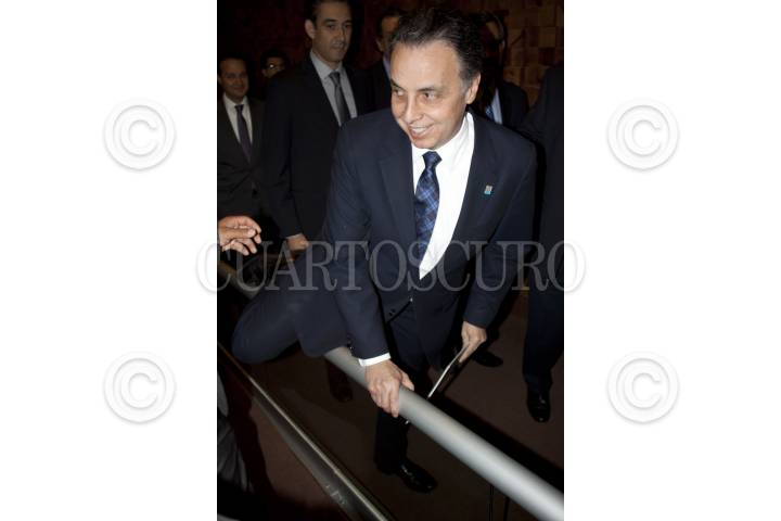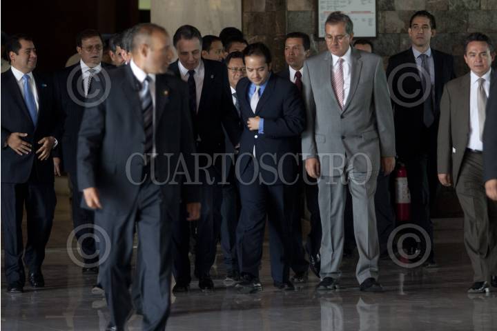 MÉXICO, D.F., 24MAYO2012.- El secretario de Economía Bruno Ferrari salta una valla al llegar al Museo de Antropología en donde presidió la Presentación y Protección de los Sitios Sagrados del Pueblo de Wirikuta, en San Luis Potosí. Durante la ceremonia se declararon 45 mil hectáreas parte de la reserva minera nacional, además de que la empresa canadiense First Majestic se comprometió a no realizar la explotación minera en el territorio sagrado de Wirikuta en San Luis Potosí, y cedió sus 22 concesiones que se encuentran en esa área al pueblo wixárika. FOTO: MOISÉS PABLO /CUARTOSCURO.COM
