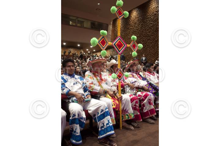 MÉXICO, D.F., 24MAYO2012.- Integrantes del pueblo Huichol durante la ceremonia en el Museo de Antropología en la cual se realizó la Presentación y Protección de los Sitios Sagrados del Pueblo de Wirikuta, en San Luis Potosí. Durante la presentación se declararon 45 mil hectáreas parte de la reserva minera nacional, además de que la empresa canadiense First Majestic se comprometió a no realizar explotación minera en el territorio sagrado de Wirikuta y cedió sus 22 concesiones que se encuentran en esa área al pueblo wixárika. FOTO: MOISÉS PABLO /CUARTOSCURO.COM