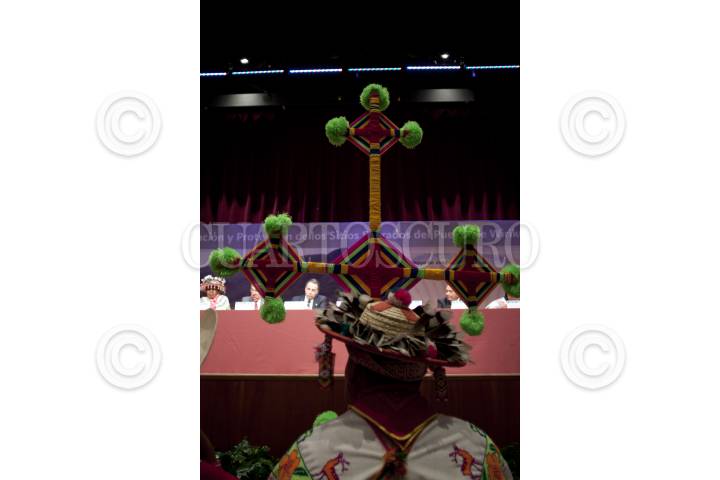 MÉXICO, D.F., 24MAYO2012.- Con la presencia de Abelardo Rodríguez, secretario de la Reforma Agraria, Bruno Ferrari, secretario de Economía, Alejandro Poiré, secretario de Gobernación, y Juan Elvira Quesada, secretario del Medio Ambiente, se dió la Presentación y Protección de los Sitios Sagrados del Pueblo de Wirikuta, en San Luis Potosí. En la ceremonia se declararon 45 mil hectáreas parte de la reserva minera nacional, además de que la empresa canadiense First Majestic se comprometió a no realizar la explotación minera en el territorio sagrado de Wirikuta y cedió sus 22 concesiones que se encuentran en esa área al pueblo wixárika. FOTO: MOISÉS PABLO /CUARTOSCURO.COM