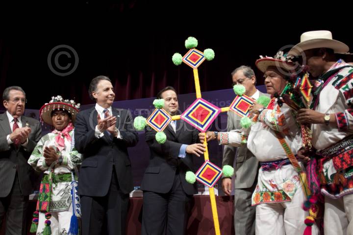 MÉXICO, D.F., 24MAYO2012.- Con la presencia de Abelardo Rodríguez, secretario de la Reforma Agraria, Bruno Ferrari, secretario de Economía, Alejandro Poiré, secretario de Gobernación, y Juan Elvira Quesada, secretario del Medio Ambiente, presidieron la Presentación y Protección de los Sitios Sagrados del Pueblo de Wirikuta, en San Luis Potosí. El encargado de la política interior del país recibió un "ojo de dios" por parte del pueblo huichol, tras terminar la ceremonia en la cual se declararon 45 mil hectáreas parte de la reserva minera nacional, además de que la empresa canadiense First Majestic no realizará la explotación minera en el territorio sagrado de Wirikuta y cedió sus 22 concesiones que se encuentran en esa área al pueblo wixárika. FOTO: MOISÉS PABLO /CUARTOSCURO.COM