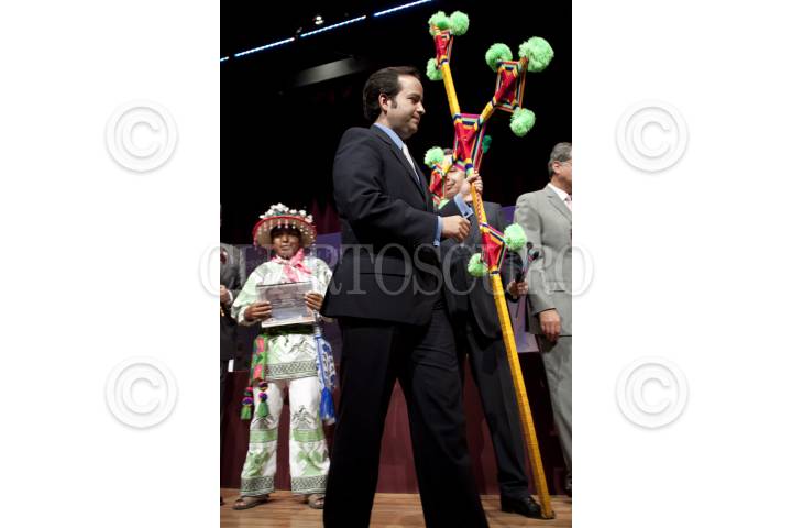 MÉXICO, D.F., 24MAYO2012.- Alejandro Poiré, secretario de Gobernación, recibió un "ojo de dios" por parte de indígenas huicholes tras finalizar la Presentación y Protección de los Sitios Sagrados del Pueblo de Wirikuta, en San Luis Potosí. En la ceremonia se declararon 45 mil hectáreas parte de la reserva minera nacional, además de que la empresa canadiense First Majestic no realizará la explotación minera en el territorio sagrado de Wirikuta y cedió sus 22 concesiones que se encuentran en esa área al pueblo wixárika. FOTO: MOISÉS PABLO /CUARTOSCURO.COM