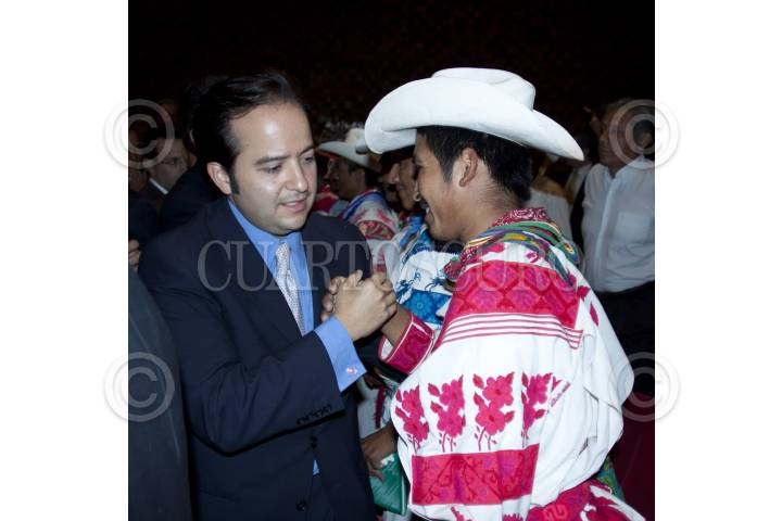 MÉXICO, D.F., 24MAYO2012.- Alejandro Poiré, secretario de Gobernación, saluda a indígenas huicholes tras finalizar la Presentación y Protección de los Sitios Sagrados del Pueblo de Wirikuta, en San Luis Potosí. En la ceremonia se declararon 45 mil hectáreas parte de la reserva minera nacional, además de que la empresa canadiense First Majestic no realizará la explotación minera en el territorio sagrado de Wirikuta y cedió sus 22 concesiones que se encuentran en esa área al pueblo wixárika. FOTO: MOISÉS PABLO /CUARTOSCURO.COM