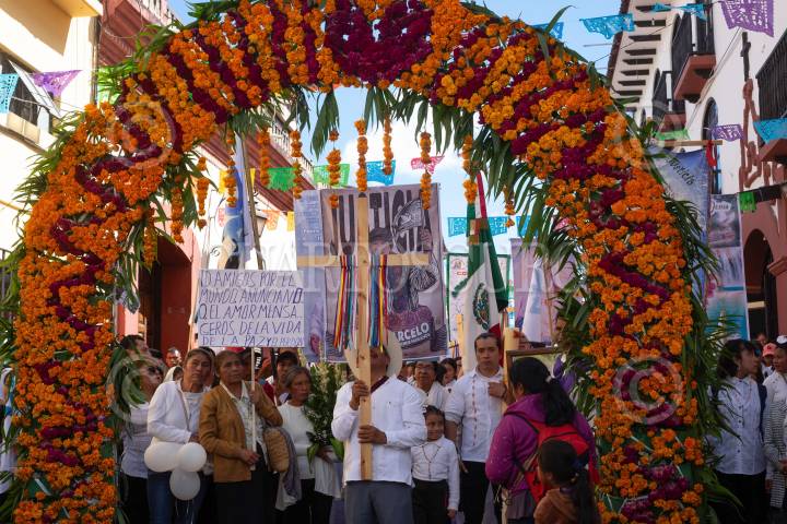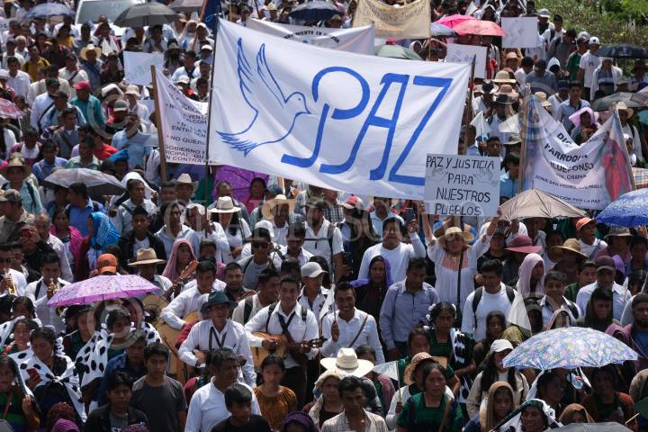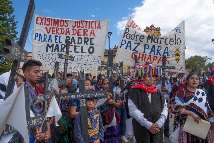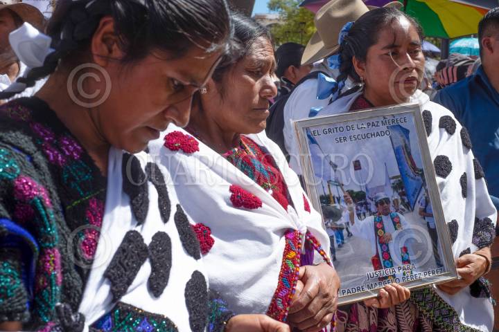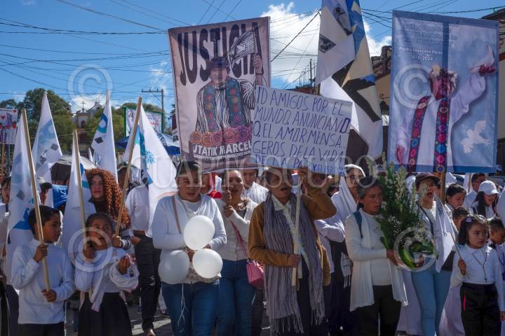 SAN CRISTÓBAL DE LAS CASAS, CHIAPAS, 03NOVIEMBRE2024.- A cien años del natalicio de Tjatik Samuel y quince días del asesinato del padre Marcelo Pérez, más de cinco mil personas marcharon por la paz, la justicia y el cese a la impunidad en el estado chiapaneco. al unísono gritaban consignas denunciando la creciente violencia en la región, la presencia de grupos armados en diferentes regiones, mientras exigían al gobierno que actúe ante la violencia que impera desde la Sierra Occidental hasta la Selva. FOTO: ISABEL MATEOS/CUARTOSCURO.COM