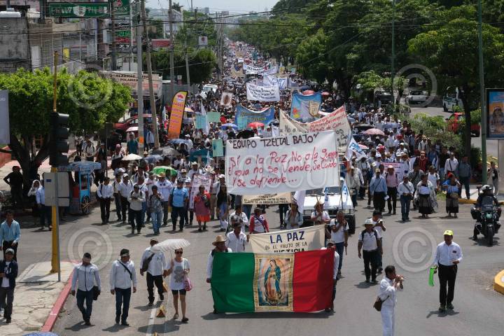 TUXTLA GUTIÉRREZ, CHIAPAS, 13SEPTIEMBRE2024.- Más de diez mil personas congregadas por las diócesis de San Cristobal de las Casas, Tapachula y la capital chiapaneca, se dieron cita en esta ciudad para marchar por La Paz en el estado, las cual se ha visto mermada por la creciente violencia que amenaza la integridad de la población civil de desde la selva hasta el Soconusco. Miles de feligreses caminaron bajo el sol de medio día cargando pancartas con la información de diferentes luchas mientras banderas blancas inundaban la calle central de Tuxtla evidenciando la falta de respuesta por las autoridades municipales, estatales y federales. FOTO: ISABEL MATEOS /CUARTOSCURO.COM
