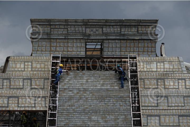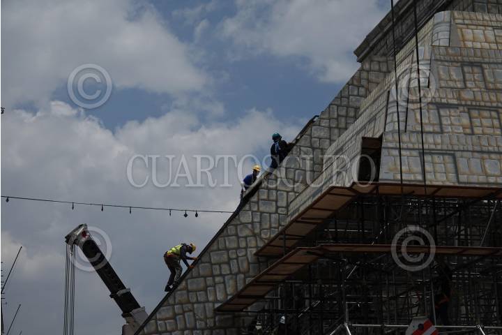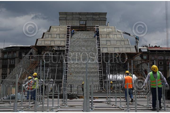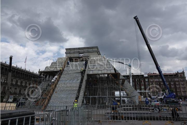 CIUDAD DE MÉXICO, 09JULIO2024.- Continúa el armado e instalación de la replica de la pirámide de Kukulcán en el Zócalo capitalino. La estructura formará parte de la proyección 2D y 3D propuesta por la Secretaria de Cultura capitalina para el espectáculo “El Pueblo Maya y Felipe Carrillo Puerto”. FOTO: GALO CAÑAS/CUARTOSCURO.COM