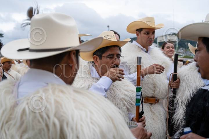 SAN JUAN CHAMULA, CHIAPAS, 30 JULIO 2025.- El electo presidente de la Suprema Corte de Justicia, Hugo Aguilar, y el ministro electo Rodrigo Arístides Guerrero fueron recibidos con un acto simbólico de bienvenida por autoridades tradicionales y pobladores en el atrio de la iglesia principal. FOTO: ISABEL MATEOS HINOJOSA/CUARTOSCURO.COM