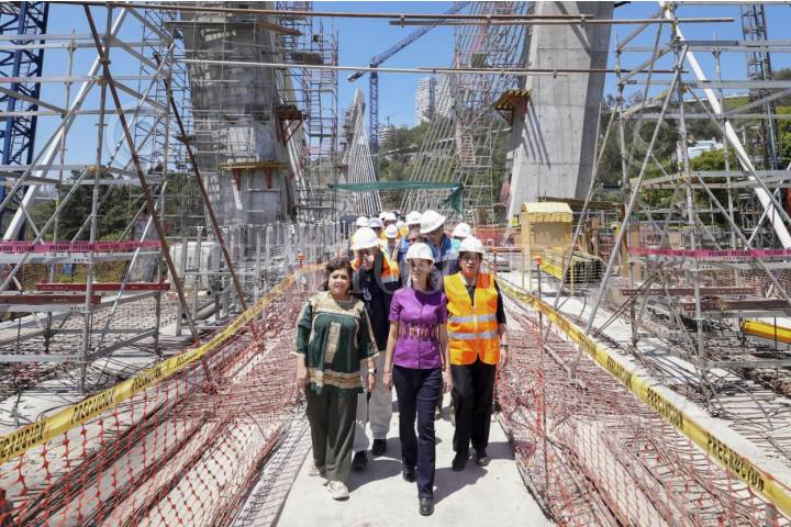 CIUDAD DE MÉXICO, 04ABRIL2025.- La jefa de gobierno Clara Brugada en compañía de la presidenta Clauda Sheinbaum realizaron la supervisión de los trabajos del puente atirantado de la última parte del tren El Insurgente, ubicado junto a la Cuarta Sección del Bosque de Chapultepec y la Universidad de la Salud. FOTO: PRESIDENCIA/CUARTOSCURO.COM
