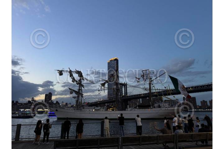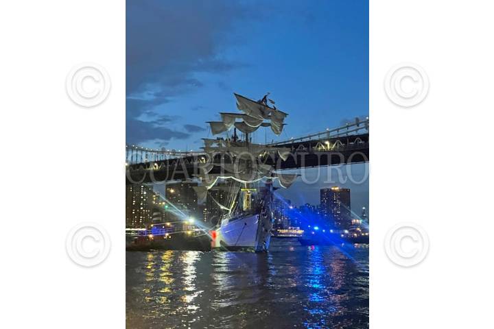 BROOKLYN, NEW YORK, 17MAYO2025.- El buque escuela naval Cuauhtémoc sufrió un accidente durante las maniobras de zarpe, provocando su colisión con el puente de Brooklyn lo que dejó un saldo de 22 lesionados y hasta el momento 2 muertes confirmadas. FOTO: ESPECIAL/CUARTOSCURO.COM