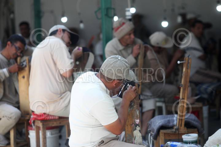 Internos de la la Penitenciaria de Puente Grande, Jalisco, trabajan en el taller donde tejen con pita cinturones para caballero.