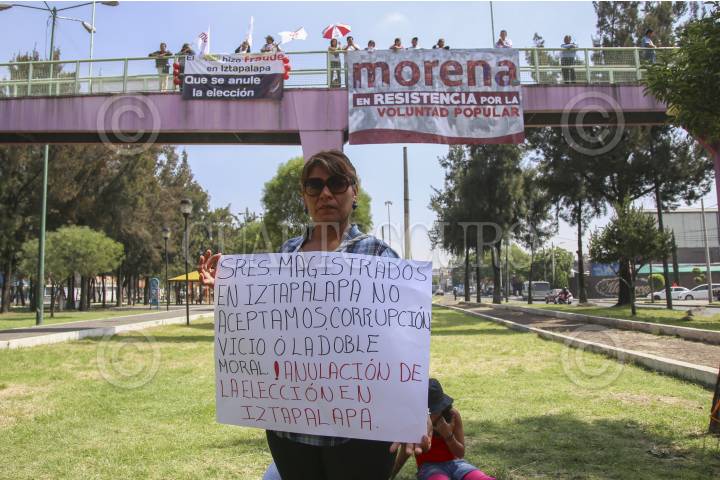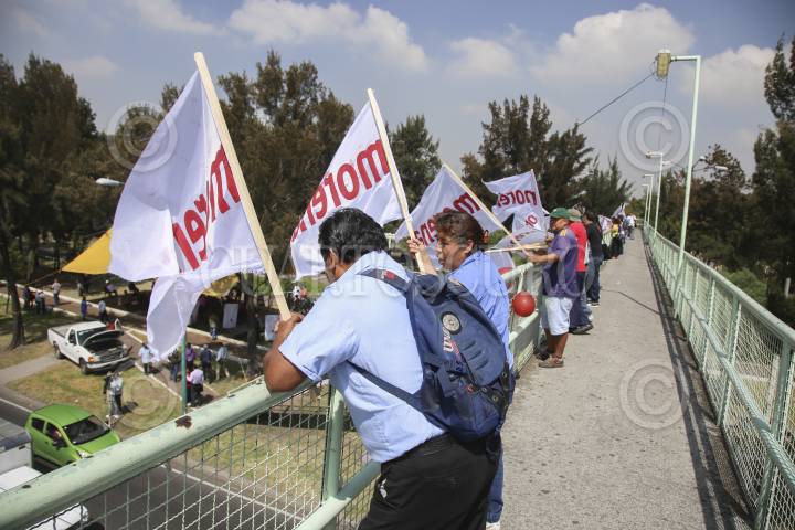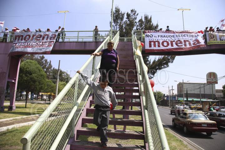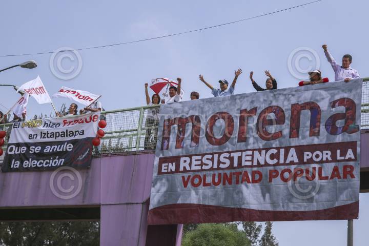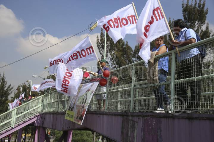 MÉXICO, D.F., 30JULIO2015.- Integrantes de MORENA, encabezados por la candidata a delegada en Iztapalapa, Clara Brugada Molina, realizaron una protesta en puentes peatonales de la demarcación donde colocaron propaganda del supuesto fraude electoral por parte de la candidata del PRD Dione Anguiano. FOTO: SAÚL LÓPEZ /CUARTOSCURO.COM