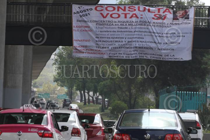 Manta a favor del juicio a expresidentes, sobre puente peatonal de periférico sur.