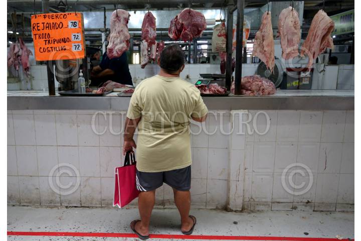Un hombre revisa los precios de la carne en un local del mercado de Mérida.