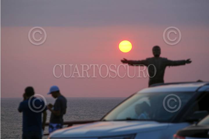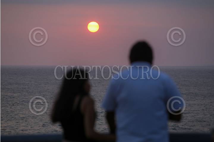 Personas observan la puesta de sol de ayer, en el auditorio al aire libre de Sinfonía del Mar, un lugar en dónde tradicionalmente las personas acuden a disfrutar del atardecer.