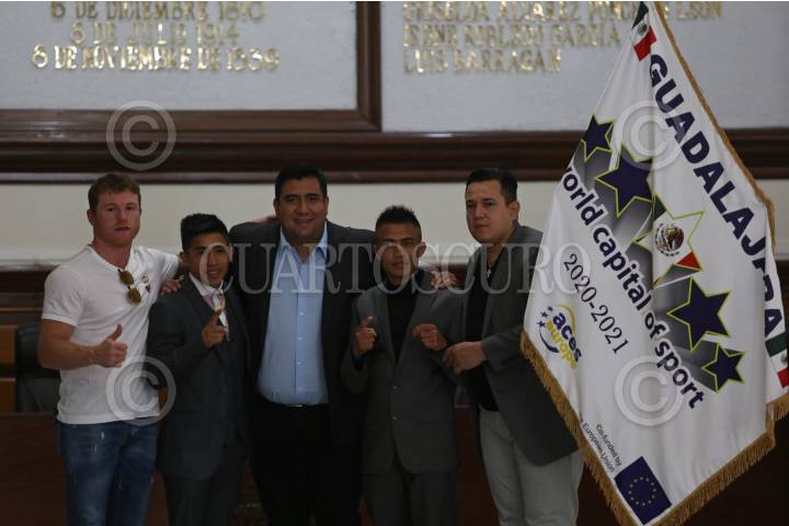 El pugilista tapatío Saúl “Canelo” Álvarez, El boxeador Julio Cesar Martínez, El presidente municipal suplente Eduardo Fabián Martínez Lomelí, el boxeador Joel Córdova y el entrenador del Canelo Eddie Reynoso, posan para una fotografía, después de la conferencia de prensa que ofrecieron este medio día en la Presidencia Municipal de Guadalajara, para presentar una cartelera boxística el próximo sábado.