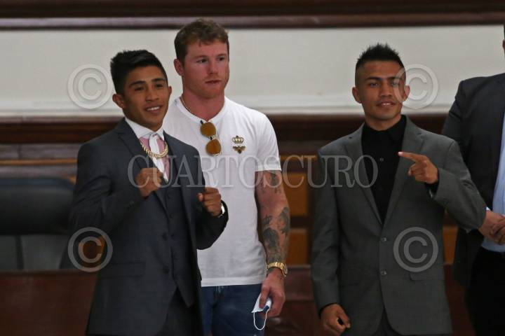 El pugilista tapatío Saúl “Canelo” Álvarez y los boxeadores Julio Cesar Martínez y Joel Córdova, posan para una fotografía después de la conferencia de prensa que ofrecieron este medio día en la Presidencia Municipal de Guadalajara, para presentar una cartelera boxística el próximo sábado.