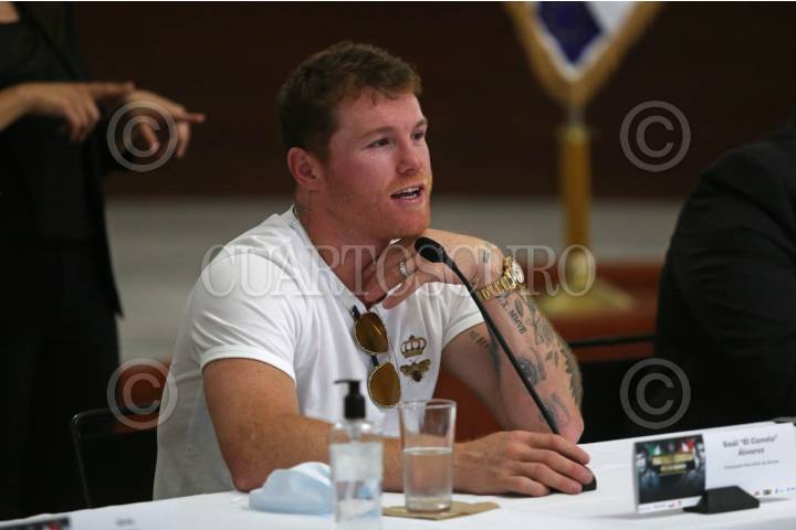 El pugilista tapatío Saúl “Canelo” Álvarez, durante su participación en la conferencia de prensa que encabezo este medio día en la Presidencia Municipal de Guadalajara, para presentar una cartelera boxística el próximo sábado.
