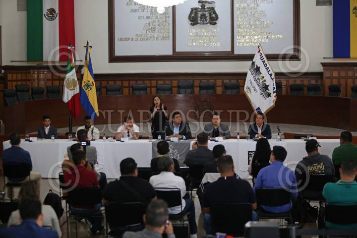 El pugilista tapatío Saúl “Canelo” Álvarez, el presidente municipal suplente Eduardo Fabián Martínez Lomelí, el entrenador del Canelo Eddie Reynoso y los boxeadores Julio Cesar Martínez y Joel Córdova, entre otras personalidades durante la conferencia de prensa que ofrecieron este medio día en la Presidencia Municipal de Guadalajara, para presentar una cartelera boxística el próximo sábado.