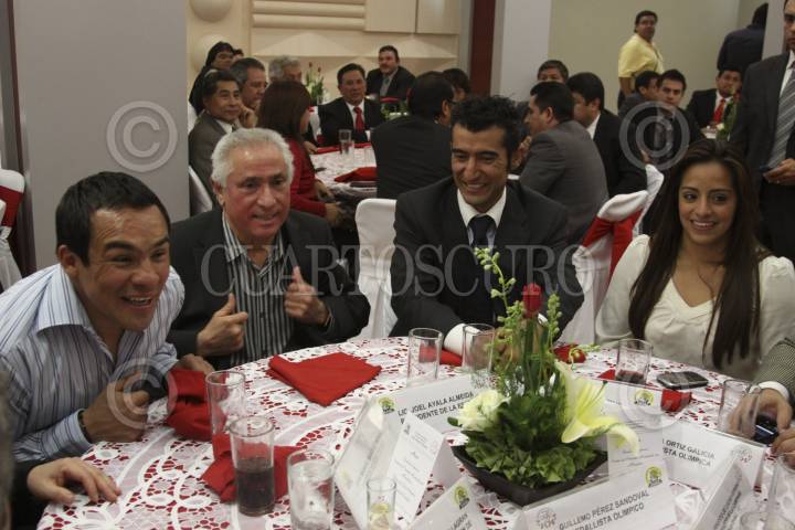 MÉXICO, D.F., 01MARZO2012.- Juan Manuel Márquez, pugilista; Joél Ayala, presidente de la FSTSE; Jesús Mena Campos, medallista olímpico; y Tatiana Ortiz, clavadista; estuvieron presentes en una comida que se le hizo al pugilista en la Federación de Sindicatos de Trabajadores del Estado. FOTO: IVÁN STEPHENS /CUARTOSCURO.COM