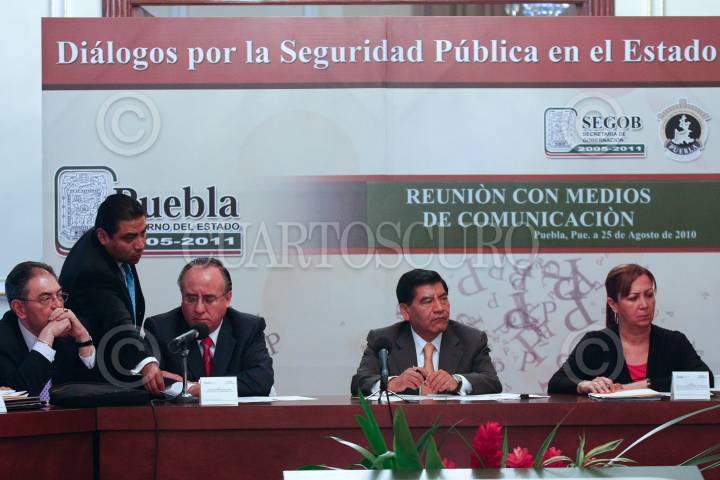 PUEBLA, PUEBLA, 25AGOSTO2010.- El gobernador del estado, Mario Marín Torres, encabezó el segundo encuentro de Diálogos por la Seguridad en el Estado, en la que se reunió con los directores y columnistas de los diferentes medios de comunicación más importantes en la entidad. Durante el encuentro los representantes de los medios expresaron sus opiniones y puntos de vista para generar alternativas que garanticen la seguridad en el estado. FOTO: FRANCISCO GUASCO/CUARTOSCURO.COM