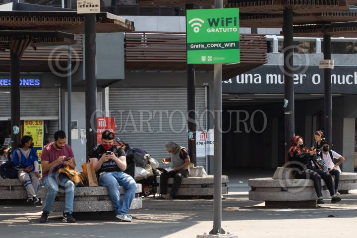 Personas navegan en un punto Wi Fi de internet gratuito en la Glorieta de los Insurgentes.