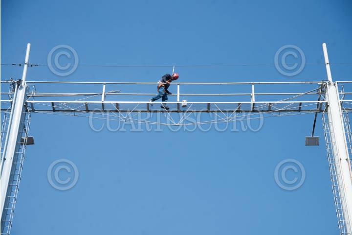 Un trabajador camina sobre la estructura de anuncios publicitarios de la terminal 2 del Aeropuerto Internacional de la Ciudad de México.