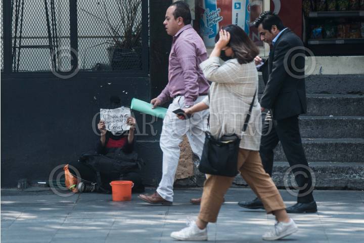 Una persona en situación desfavorable solicita apoyo ante la indiferencia de transeúntes que pasan sobre avenida Juárez en el centro histórico.