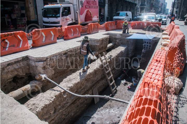 Especialistas del Instituto Nacional de Antropología e Historia (INAH) supervisan los trabajos de obra y mantenimiento que se realizan sobre la calle Isabel La Católica en el Centro Histórico.