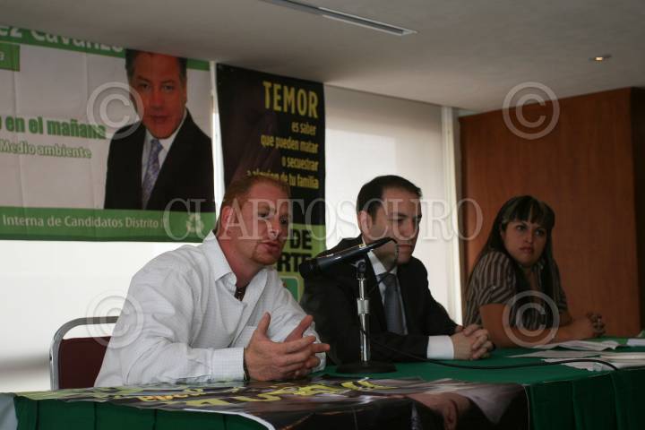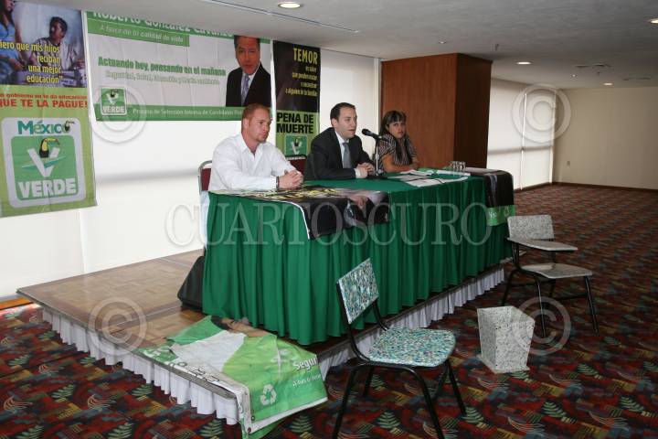 MÉXICO D.F., 10JULIO2009.- Jorge Legorreta Ordorica, Senador por PVEM, acompañado de Bernardo Cruz Tergo, Director General de Reciclatec de México y de Angélica Chacon Ruiz, Secretaria del Medio Ambiente del PVEM, donde dio a conocer la donación que ara a la empresa Reciclatec, esto para que con los desechos de esa propaganda se fabriquen pupitres, sillas y botes de basura que serán donados a diversas escuelas del país. FOTO: GUILLERMO PEREA/CUARTOSCURO.COM