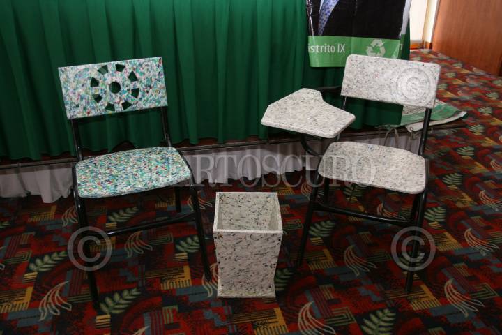 MÉXICO D.F., 10JULIO2009.- Pupitres, sillas y botes de basura que serán donados a diversas escuelas del país los cuales serán fabricados por Reciclatec de México, esto partir de la donación de los desechos de la propaganda electoral que el PVEM donara. FOTO: GUILLERMO PEREA/CUARTOSCURO.COM