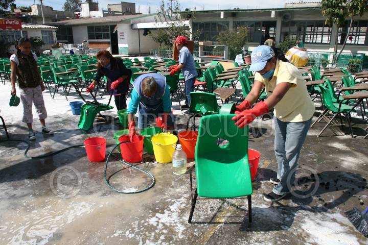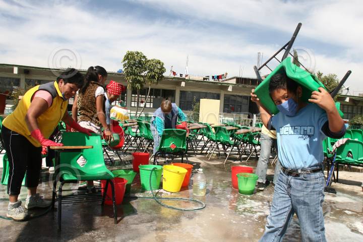 MÉXICO, D.F., 07MAYO2009.- Padres de familia acudieron a las escuelas primarias de la ciudad para desinfectar y hacer limpieza de los salones, pupitres y demás instalaciones como medida preventiva para evitar la propagación del virus de la influenza humana AH1N1 en los niños que el próximo lunes regresarán a clases. FOTO: RODOLFO ANGULO/CUARTOSCURO.COM