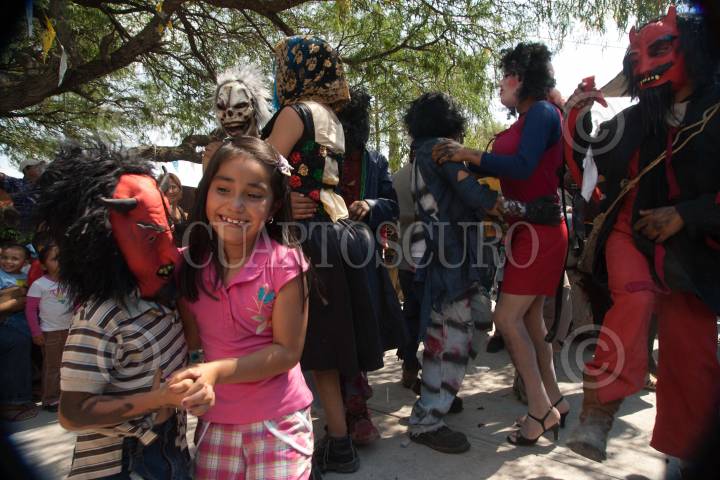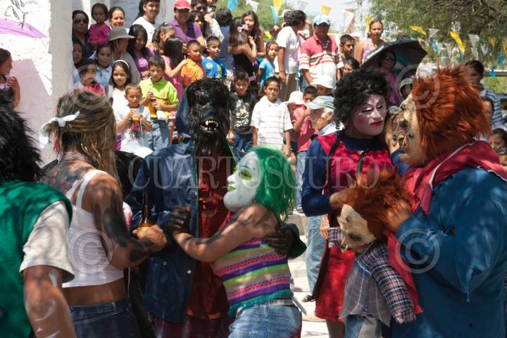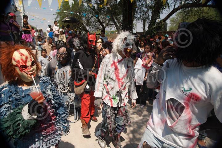 VILLA CORREGIDORA, QUERÉTARO, 29MAYO2011.- Festividad de la Cruz del pueblo de Arroyo Hondo, donde hay una mezcla de lo religioso-pagano con la danza de los "Frachicos", personajes que acuden a llevarse la mala vibra de los habitantes y regresarsela en bondades. Al terminar la danza los habitantes regalan comida a todo aquel que acude a la festividad, que se realiza año con año. FOTO: DEMIAN CHÁVEZ/CUARTOSCURO.COM