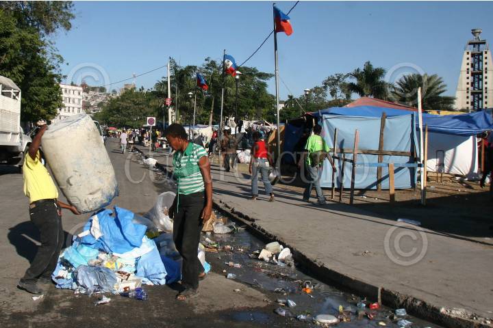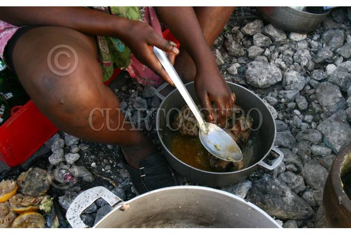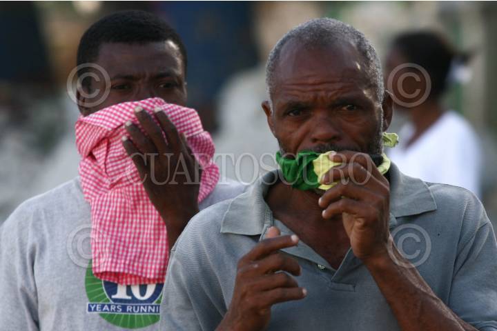 PUERTO PRINCIPE, HAITI., 01FEBRERO2010.- Haiti, se encuentra al borde de una epidemia debido a que carecen de servicios básicos como el del sanitario, miles de mujeres preparan alimentos en la vía pública, el sistema de agua potable es escaso, la basura es visible en todas las calles de Puerto Principe y el olor putrefacto se mezcla con el de humanos que se quedaron atrapados en los escombros. Los cubrebocas es parte esencial para transitar por las calles de Haiti. FOTO: SAÚL LÓPEZ/CUARTOSCURO.COM
