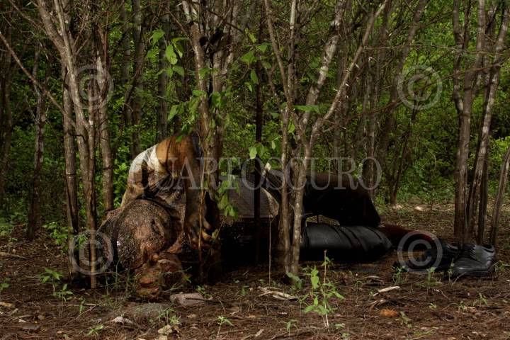 CULIACAN, SINALOA 19JULIO2011; Un taxista de la central camionera fue localizado sin vida y en avanzado estado de putrefaccion en un monte a unos metros de la carretera, en el ejido Quincito sindicatura costa rica, hasta el momento se deconoce las cauas de la muerte. en el lugar de los hechos se encontró unos zapatos y un gafete que lo acreditaba como taxista; al lugar arribaron elementos del ministerio publico y periciales para dar fe y realizar las investigaciones correspondientes. FOTO: RASHIDE FRÍAS/CUARTOSCURO.COM