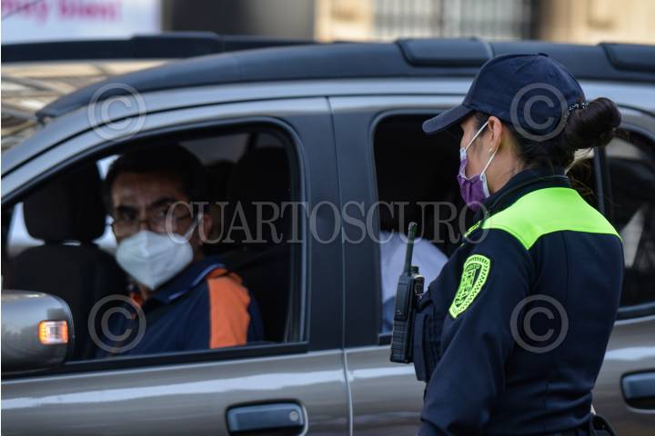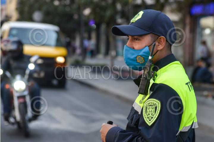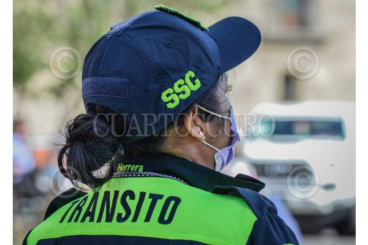 Elementos de tránsito en las inmediaciones de zócalo capitalino. A partir del 4 de abril la policía de tránsito renovará su uniforme, el cual incluirá en el brazalete verde fosforescente un código QR que permitirá identificar al elemento y la leyenda "Autorizado para infraccionar", además las multas serán levantadas través de un dispositivo móvil.