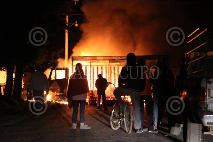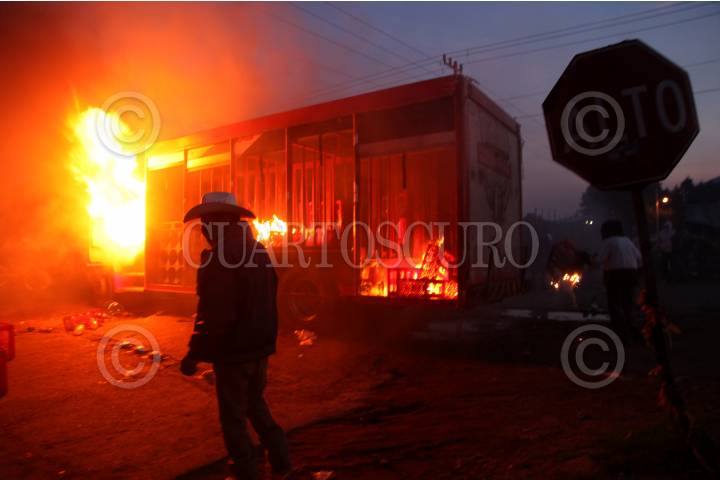 NAHUATZEN, MICHOACÁN, 19MAYO2016.- Pobladores tomaron la determinación de comenzar la quema de camiones secuestrados en los últimos días de transnacionales y camionetas de gobierno (CFE); cómo medida de presión después de la nula respuesta del gobierno para establecer el diálogo, a pesar del compromiso de gobierno que para las 7:00 p.m. del pasado 18 de mayo, los policías que estudiaron en la academia fueran uniformados, armados y equipados con patrullas y así los pobladores tener confianza en la seguridad elegida por usos y costumbres. FOTO: ALAN ORTEGA /CUARTOSCURO.COM