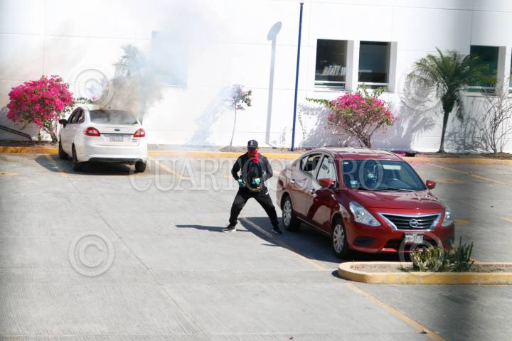 CHILPANCINGO, GUERRERO, 12MARZO2024.- Estudiantes de la Normal Rural de Ayotzinapa ingresaron a las instalaciones de la Fiscalía General del Estado (FGE) para lanzar petardos y bombas molotov, donde quemaron los vehículos que localizaron en el área del estacionamiento. Los normalistas rurales llegaron a la capital del estado a bordo de seis autobuses de pasajeros, ingresaron por la entrada norte de la capital del estado y se dirigieron al sector sur, para llegar hasta las instalaciones de la Fiscalía General del Estado (FGE). A pesar del resguardo que habían implementado en la zona elementos de la Policía del Estado y de la Guardia Nacional (GN) con equipo antimotin, no hicieron mucho por contener la irrupción de los estudiantes. La actividad se generó tras la revelación hecha por el presidente de la República, Andrés Manuel López Obrador, en el sentido de que el policía responsable del asesinato cometido en contra de su compañero, Yanqui Kothan Gómez Peralta se había fugado. FOTO: DASSAEV TÉLLEZ ADAME/CUARTOSCURO.COM