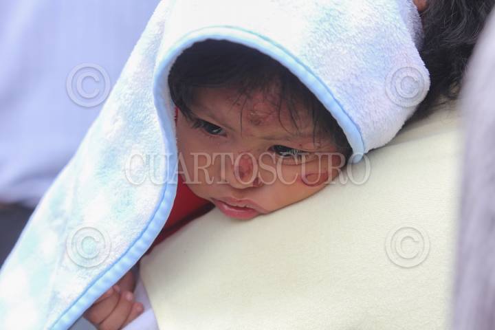 ECATEPEC, ESTADO DE MÉXICO, 10MAYO2013.- Joseph Peña Rojas un niño de tres años que resulto con quemaduras en el rostro tras la explosión de un pipa de gas en la colonia San Pedro Xalostoc, acudió con su madre la reunión con vecinos afectados que mantuvieron con el gobernador y el titular de la SCT. FOTO: SAÚL LÓPEZ /CUARTOSCURO.COM