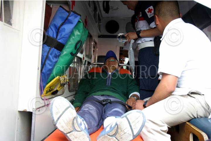 MÉXICO, D.F., 20JUNIO2010.- Benjamín González García de 35 años vigilante del colegio Pedregal, recibió en la caseta de vigilancia una caja envuelta para regalo que se la dio un taxista en la puerta ubicada en Carretera Atizapan - Villa Nicolás Romero. Al destapar el ragalo, este le estallo en las manos causándole graves lesiones en cara y cuerpo por quemaduras. Al lugar arribaron la ambulancia 049 de Protección Civil y la unidad 005 del cuerpo de Bomberos; dicho sujeto fue trasladado al hospital de Lomas Verdes en donde se reporta como grave. FOTO: LUIS CARBAYO/CUARTOSCURO.COM